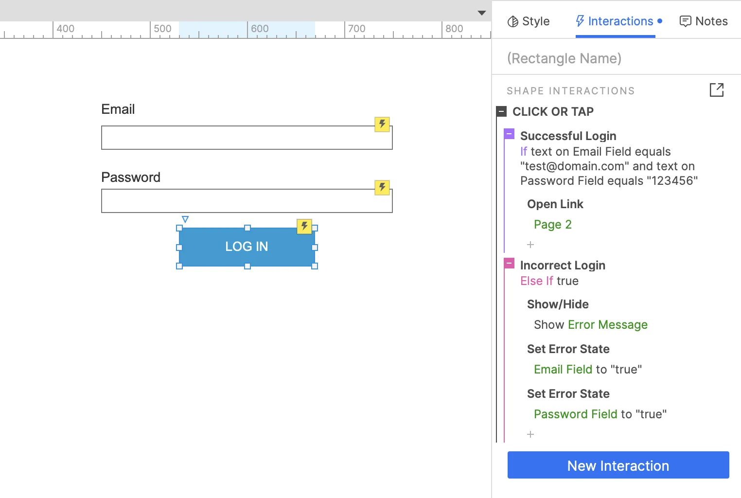 In the example of a login submission form, you may have a login button with a Click or Tap > Open Link > Page 2 interaction. Then, you can add conditional logic that states "If text on Email Field equals test@domain.com and text on Password Field equals 123456." You can also take this a step further by adding another case for incorrect submissions, where the user will see an error message or an error state if their credentials are incorrect.