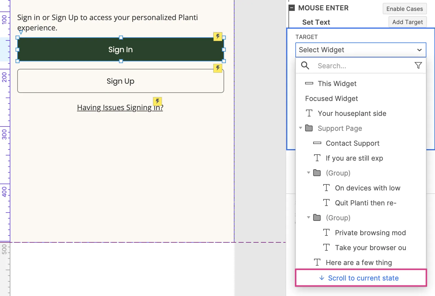 As your prototypes grow and as you have more dynamic panels and widgets on your pages, navigating through the target dropdown list when building an interaction becomes more challenging. However, in Axure RP 10, when adding interactions to a widget within a panel state, you can now scroll directly to that state in the target dropdown list by clicking the "Scroll to current state" button at the bottom of the list. This makes finding the right widget in the correct dynamic panel state a breeze and will ensure that you won't mistake one panel state for another.