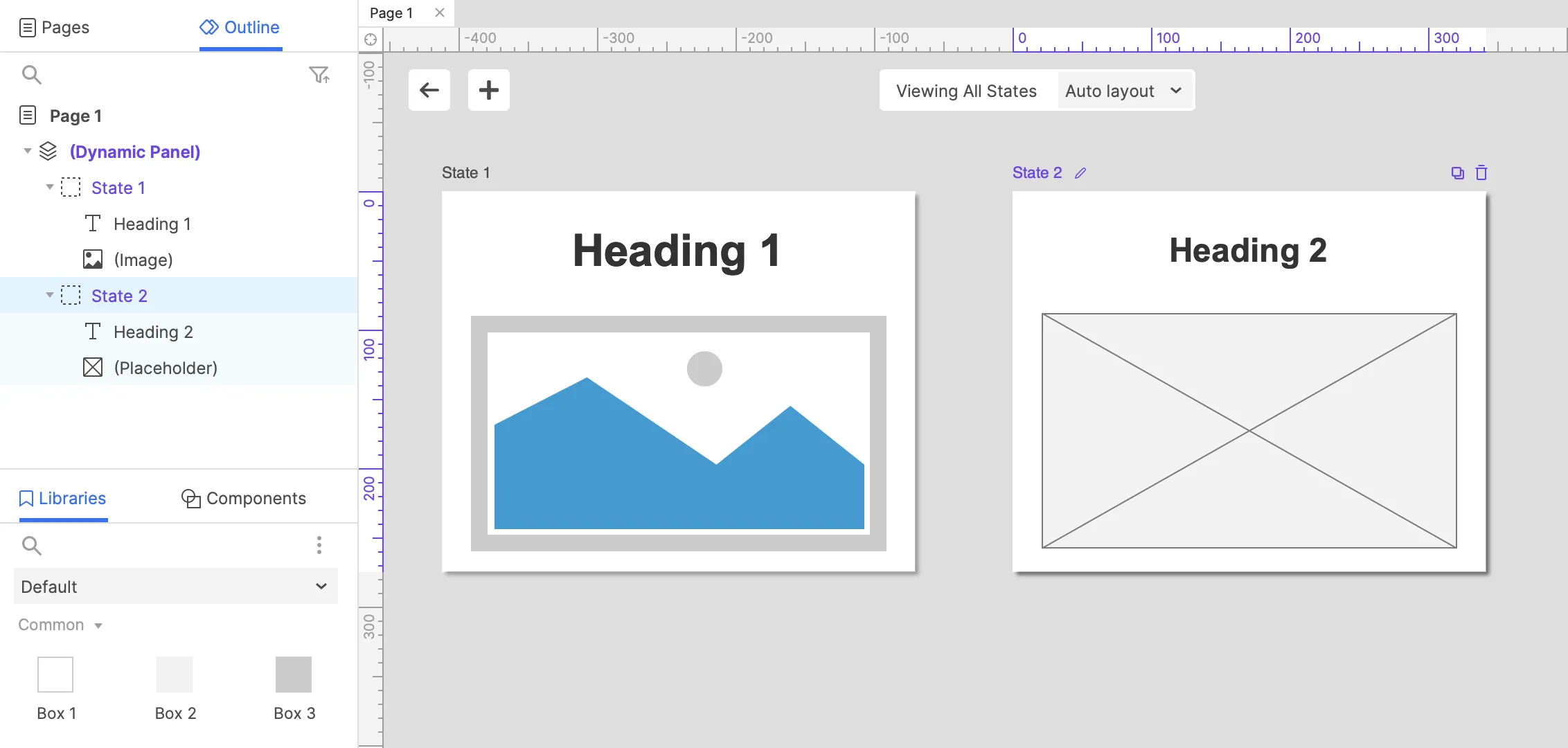 When creating your prototypes, the amount of widgets you have on a page can add up quickly, and keeping track of them can be a task in and of itself. If you have multiple dynamic panels on a page, naming them will help you to easily keep track of which one is which in the Outline pane and in the target dropdown menu when building interactions. Additionally, you can also give your panel states different names as well.