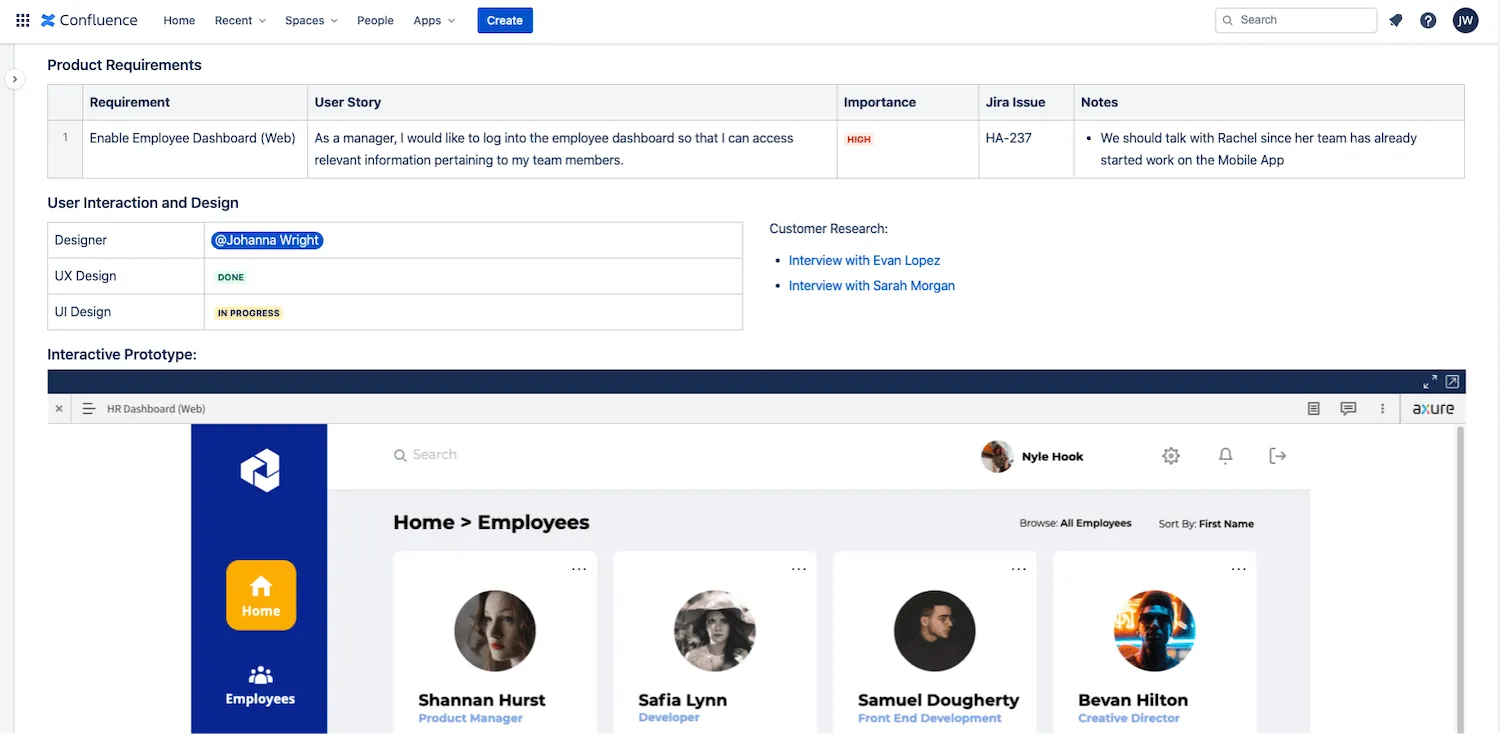 Confluence pages can be a great place to record and distribute high-level project information like requirements, key collaborators, relevant customer research, and more. As a project progresses, prototypes that illustrate that progress are also a great addition to this central source of truth.