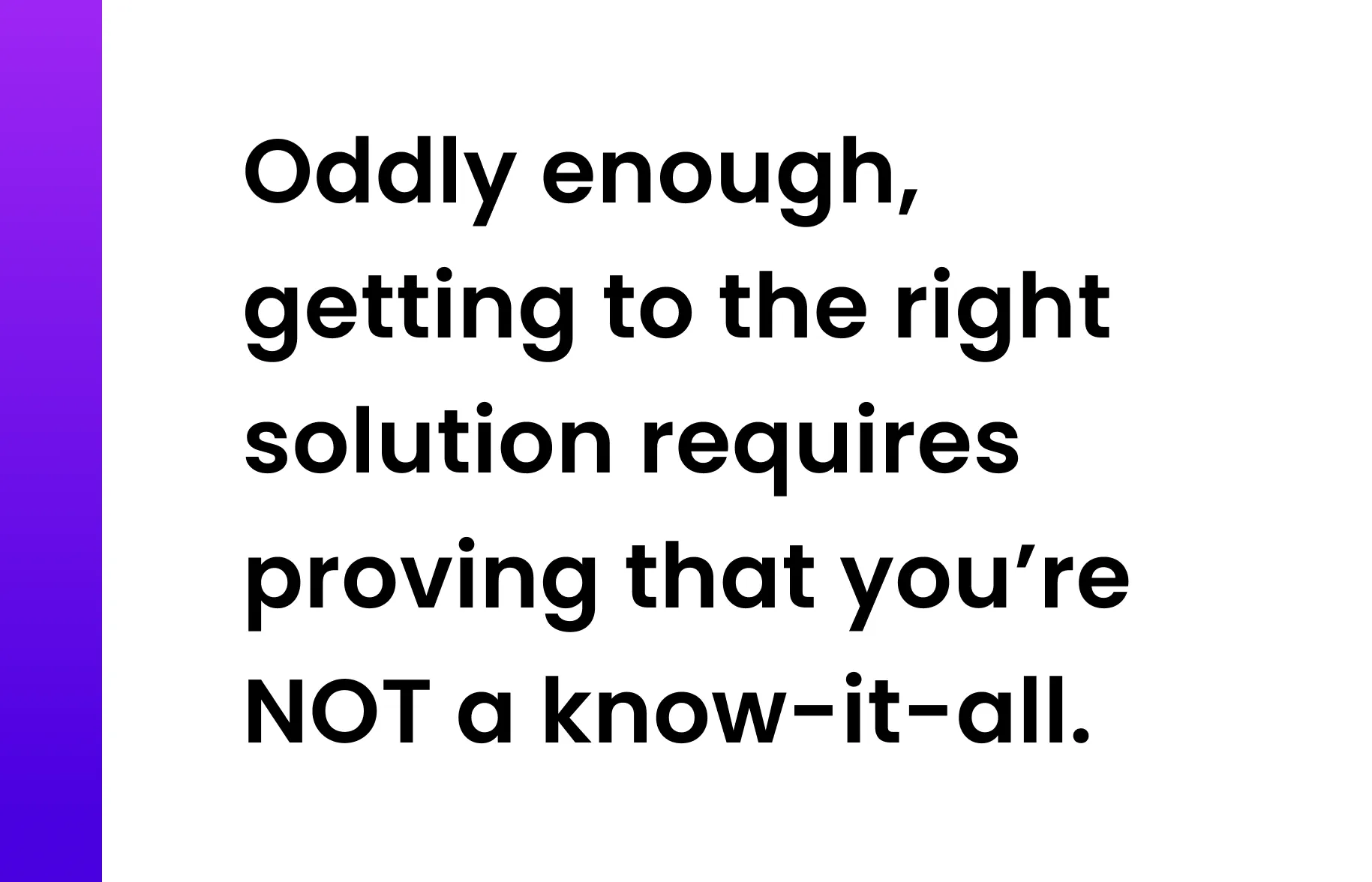 Oddly enough, getting to the right solution requires proving that you're NOT a know-it-all. Show them multiple options. Present prototypes without the visual polish. Prove that you're not just trying to get them to say "Yes" and you'll get real, honest, valuable input that just might make you look superhuman.
