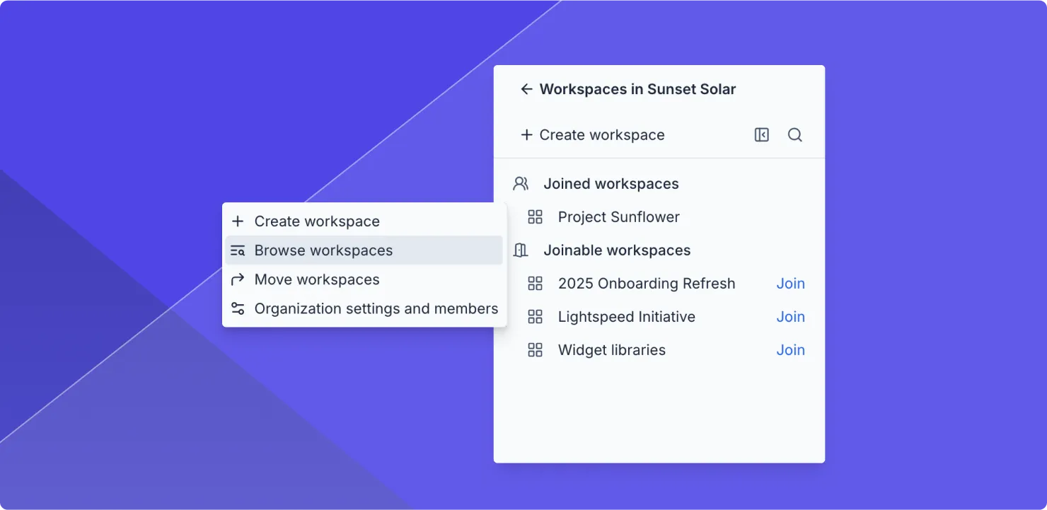 Use the new Browse Workspaces feature to easily find and join workspaces in your organization. You'll see a list of joinable workspaces in your organization and a button to quickly join the ones you want.