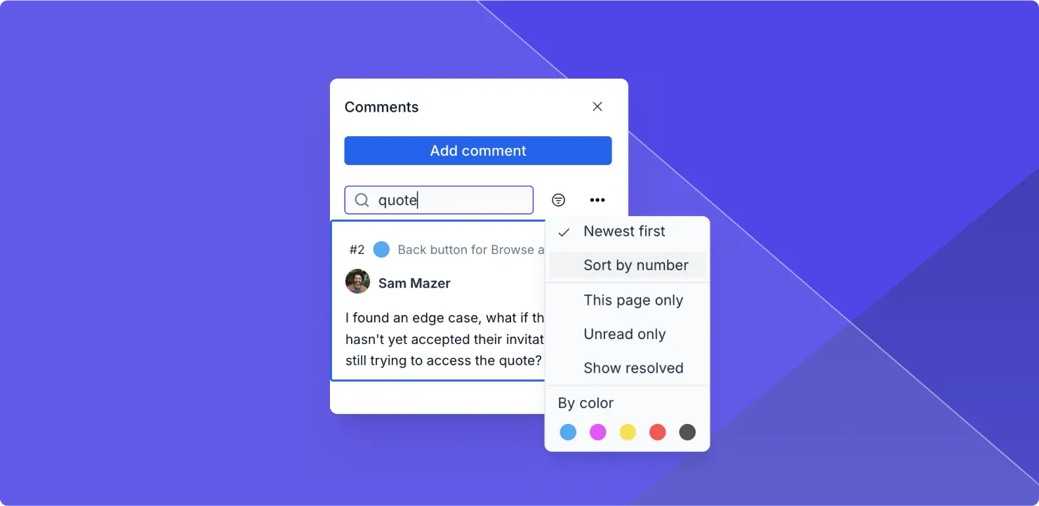 Now you can search and sort through comments on your prototypes to find exactly what you're looking for. Quickly find feedback, organize discussions, and follow up on unresolved threads.