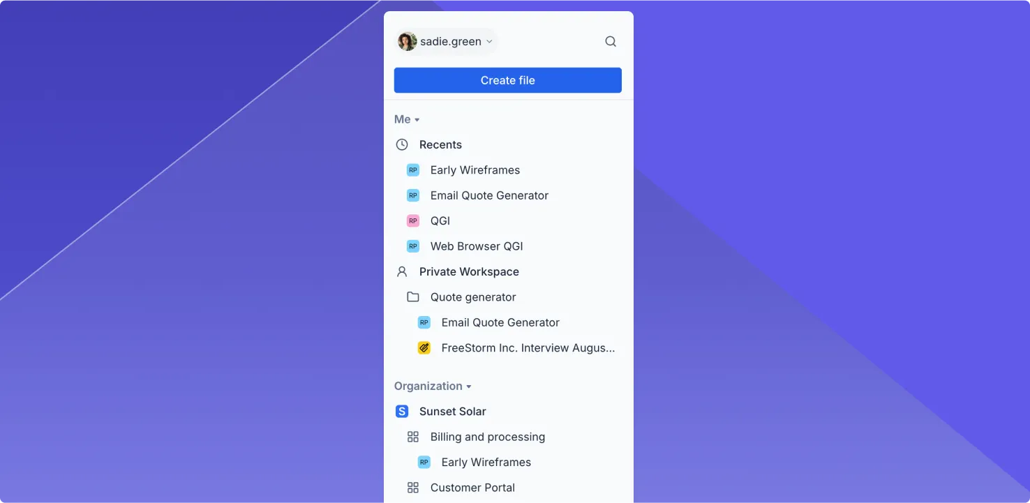 Use the new sidebar to quickly find and access your work. You can get to your recent files at the top and jump to files in workspaces directly from the sidebar.