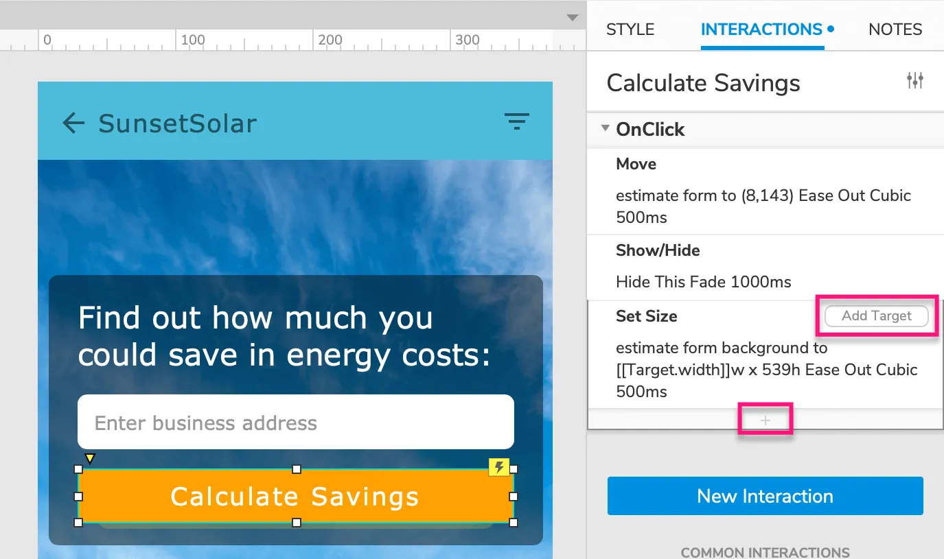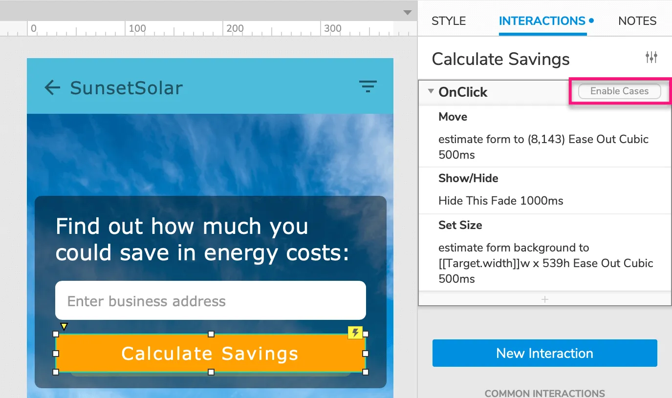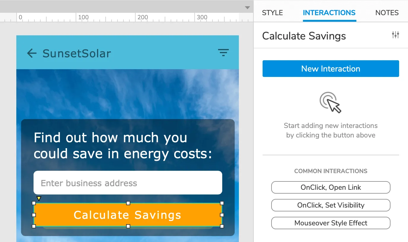 The new Interactions pane includes an interface for building interactions right in the pane itself. To get started, select a widget and click New Interaction or one of the widget-specific Common Interactions shortcuts.