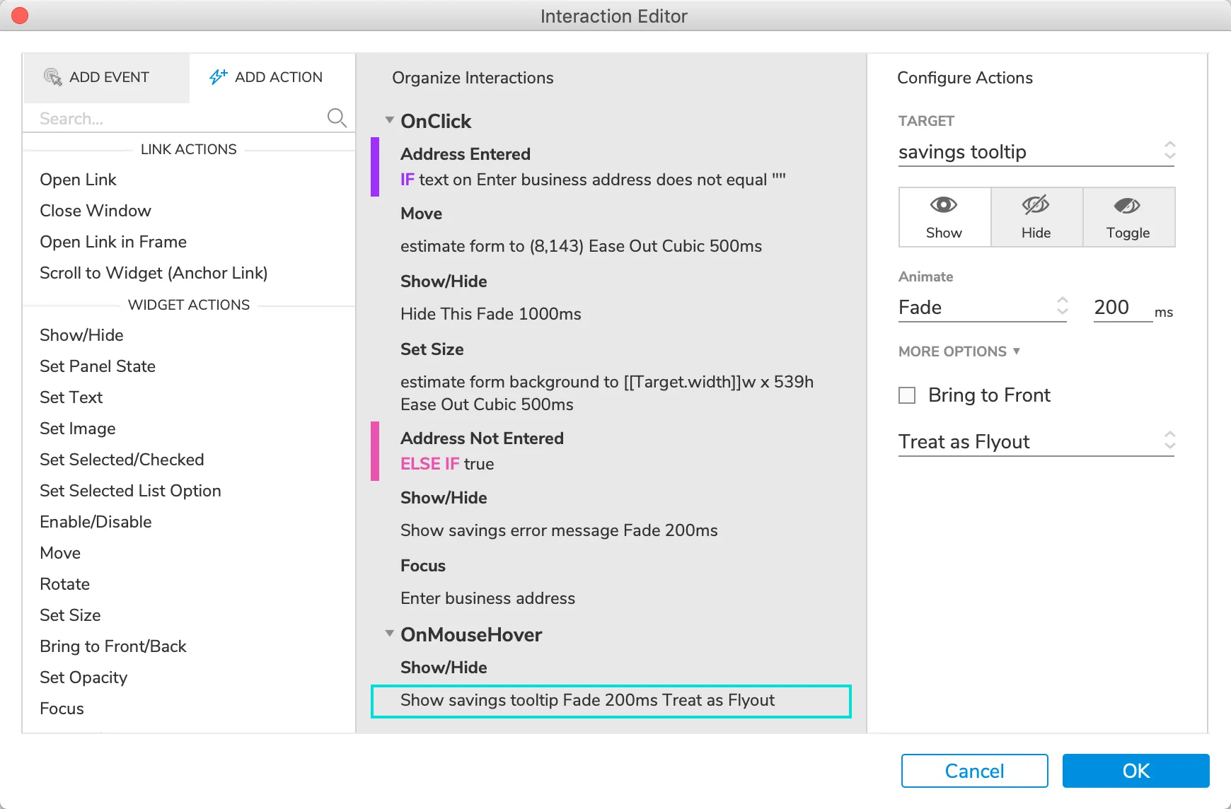 One of our main goals for Axure RP 9 was to make interactions simpler, speedier, and more approachable for both new and experienced users. After a lot of internal testing and tons of feedback from beta testers, we think we've achieved that goal with the new interactions workflow.