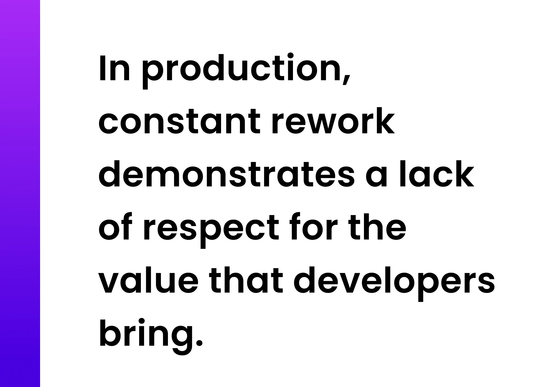 On the design side, this type of iteration is productive and leads to better outcomes which is core to the value that design brings. In production, constant rework demonstrates a lack of respect for the value that developers bring. Changes to the code require considering several ways a change can be implemented, understanding the impacts of each change, some experimentation to see where things may fail, and testing for and resolving bugs and edge cases after implementation. Doing these things well separates senior developers from junior developers.