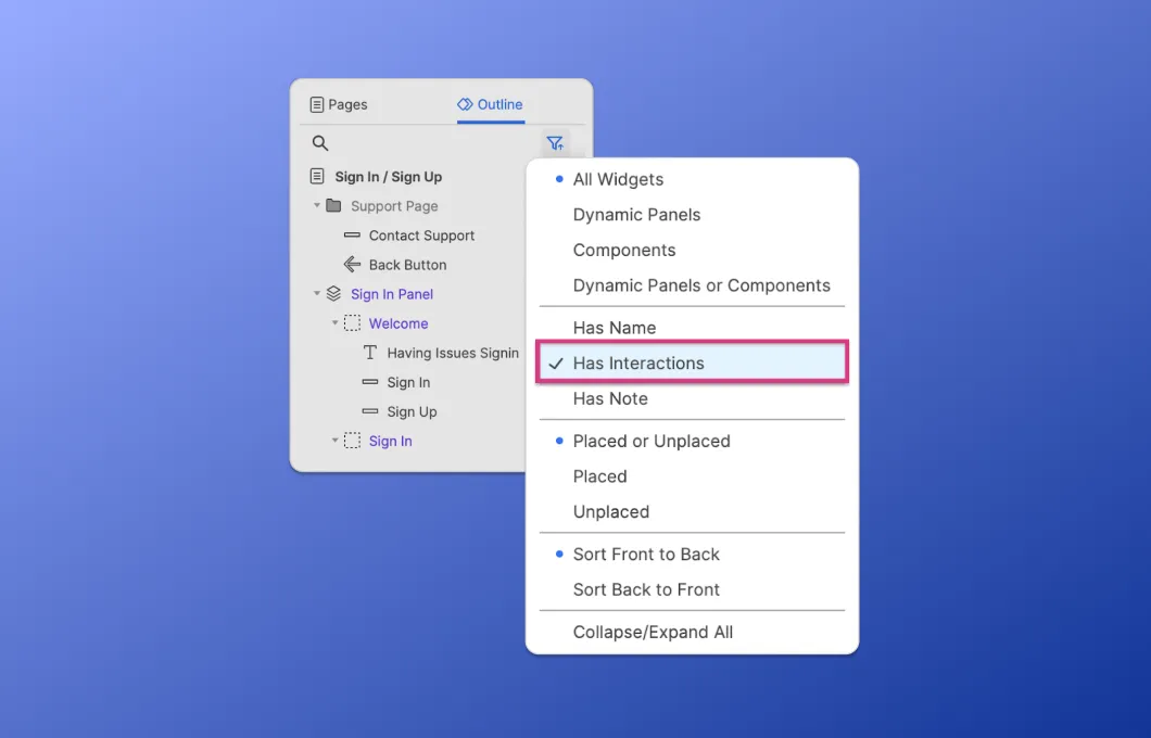 With any UX tool, staying organized is the key to working quickly and efficiently. In Axure RP, the outline pane is an easy way to stay organized by tracking widgets, placing them in folders, and using filters to sort them according to your needs.