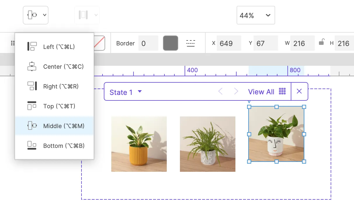 It's now easier to align objects relative to their parent container—whether it's a page or a dynamic panel. This is particularly useful when working with nested dynamic panels or editing widgets within a page with a fixed size. Here's how it works: