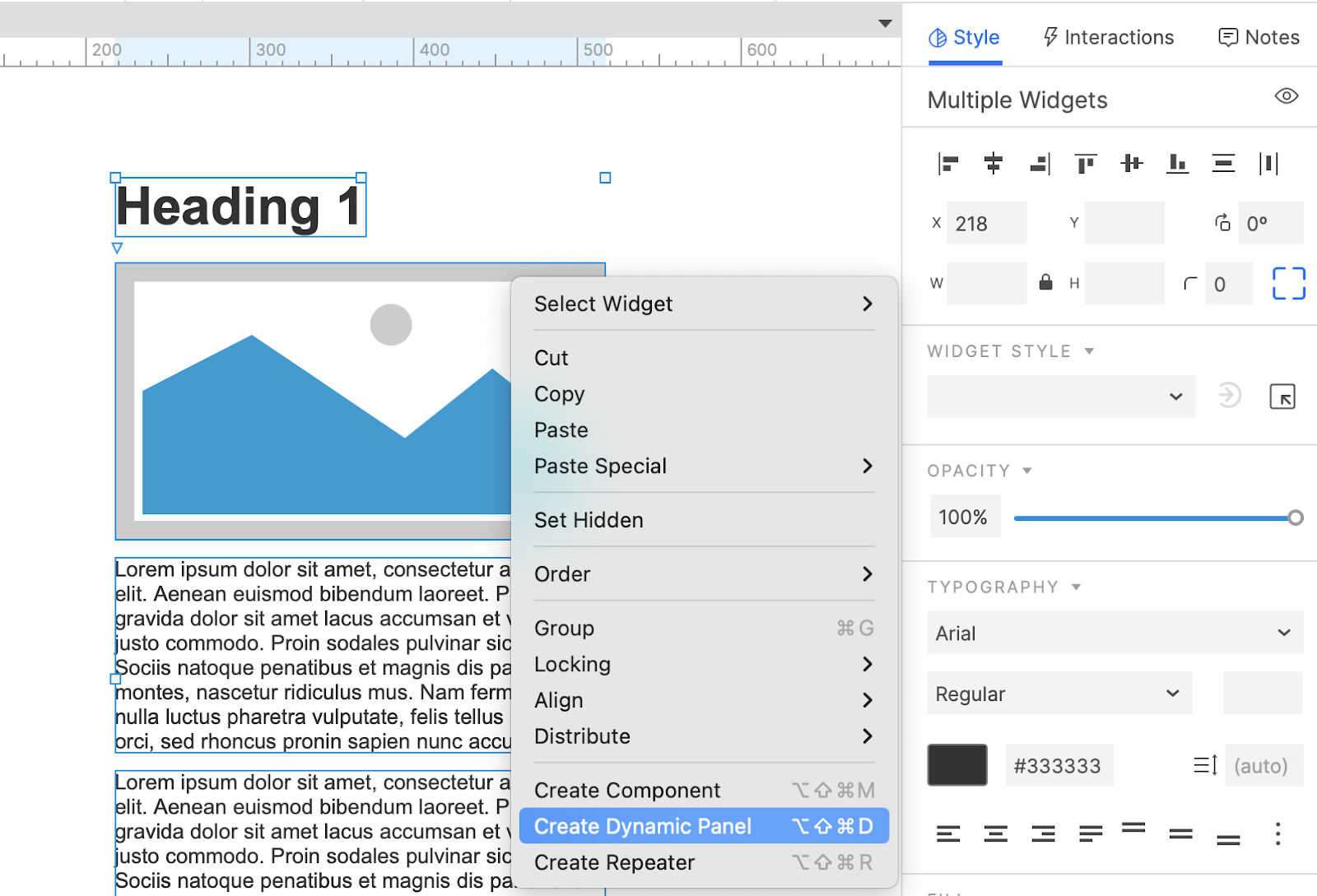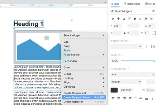 You can add a dynamic panel by dragging one from the Libraries pane or by drawing one using the option in the Main Menu (shortcut “D”). Alternatively, you can right-click a widget (or multiple selected widgets) on the canvas and select Create Dynamic Panel from the context menu.