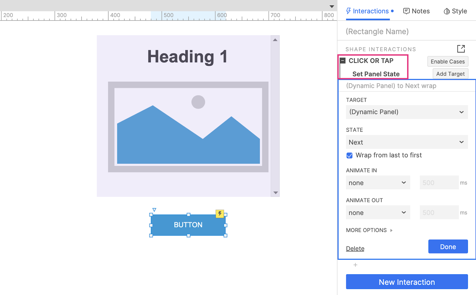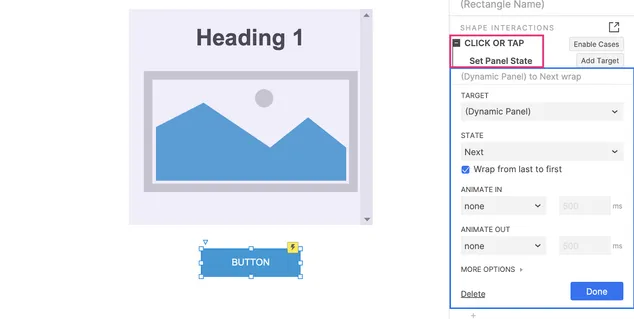 - Choose Click or Tap, and then select the Set Panel State action, and choose the dynamic panel from the target dropdown list.