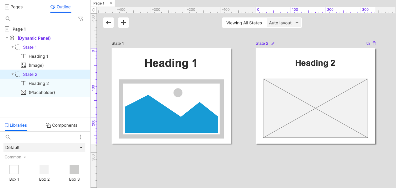 Dynamic panels are containers with multiple states, and you can easily change which state is visible using interactions. This makes it easy to swap content to demonstrate functionality. In addition, here are some more things you can do with dynamic panels: