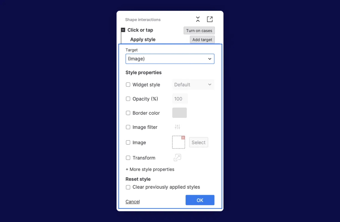 Use the Apply Style action to dynamically change colors, fonts, and other style properties on widgets in the prototype.