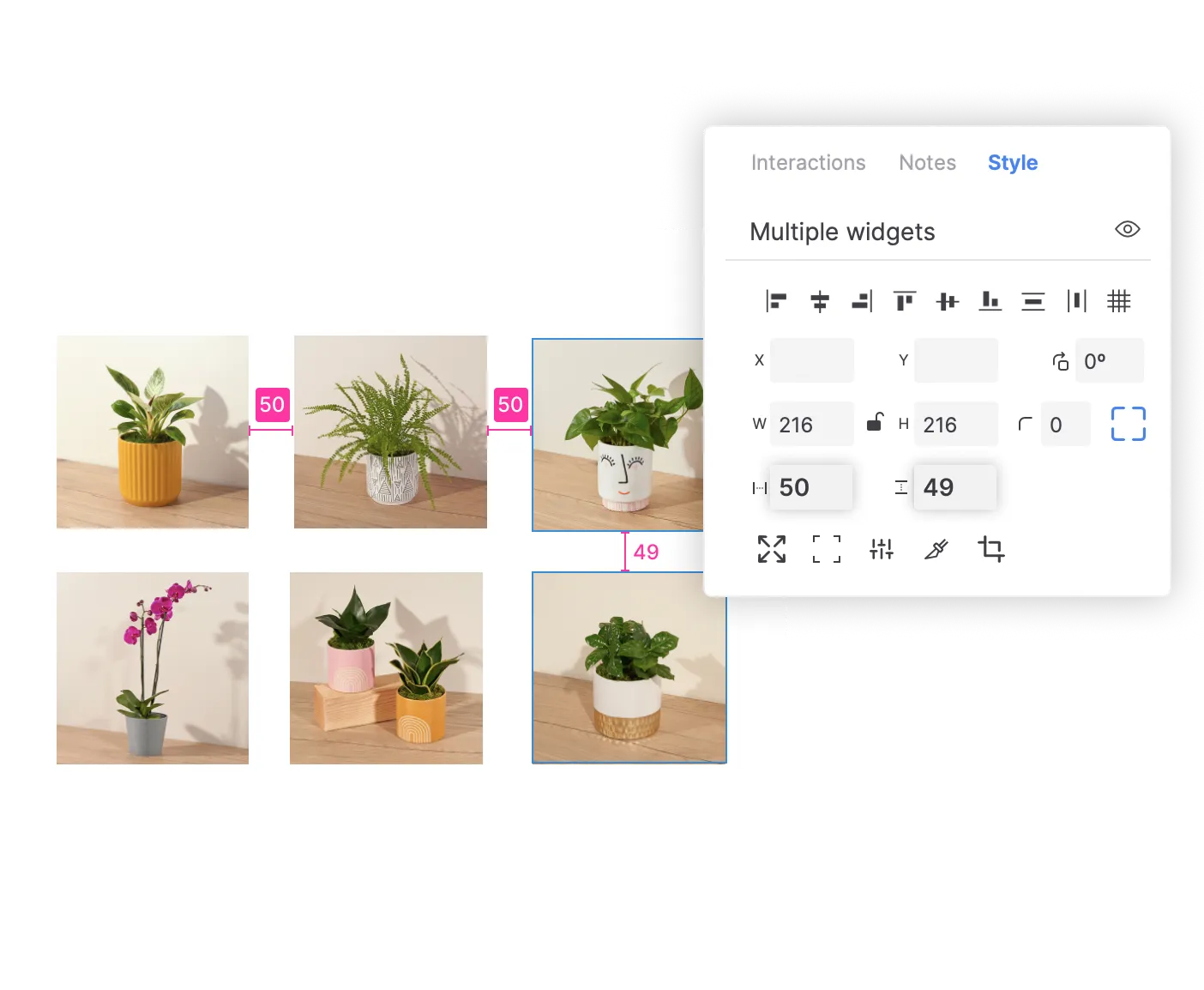 Quickly distribute widgets horizontally, vertically, or on a grid. Once they are equidistant, you can easily change the space between them and reorder them.